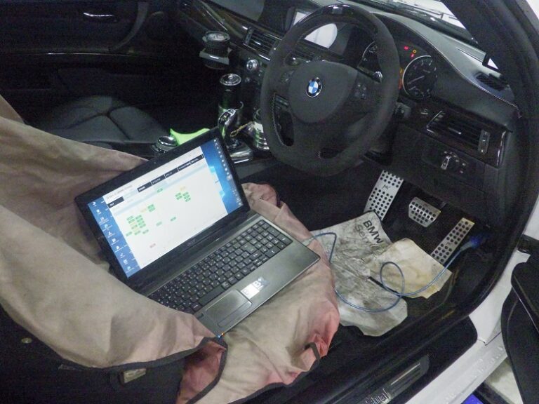 最後にBMW専用テスターを車両に接続してコンピューター診断を行いエラーチェック、消去、