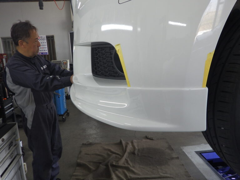 フロントリップスポイラーの取り付けを作業しました。こちらのスポイラーは、ウレタン製品となりますので