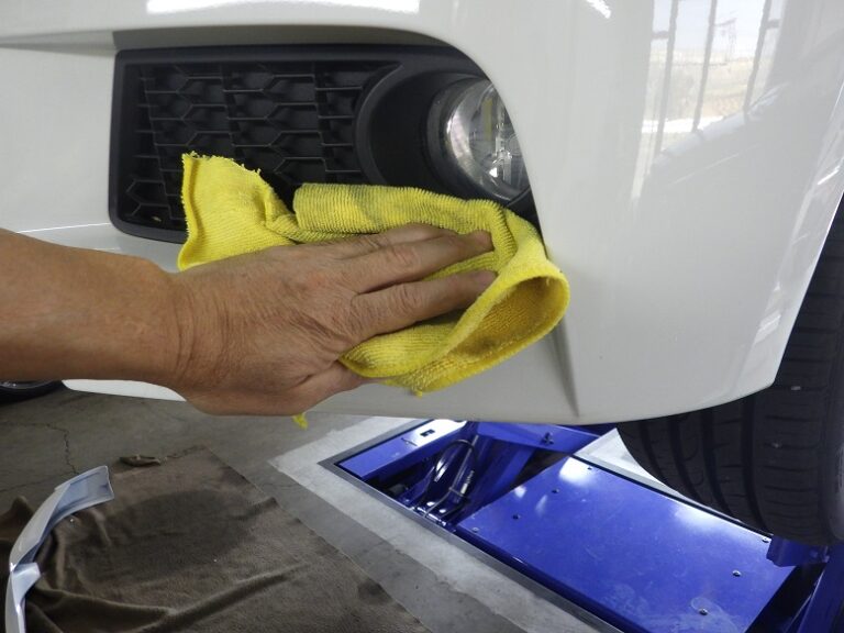 取り付けの際は、車両をリフトアップして スポイラーの仮合わせをして取り付け位置決めを行います