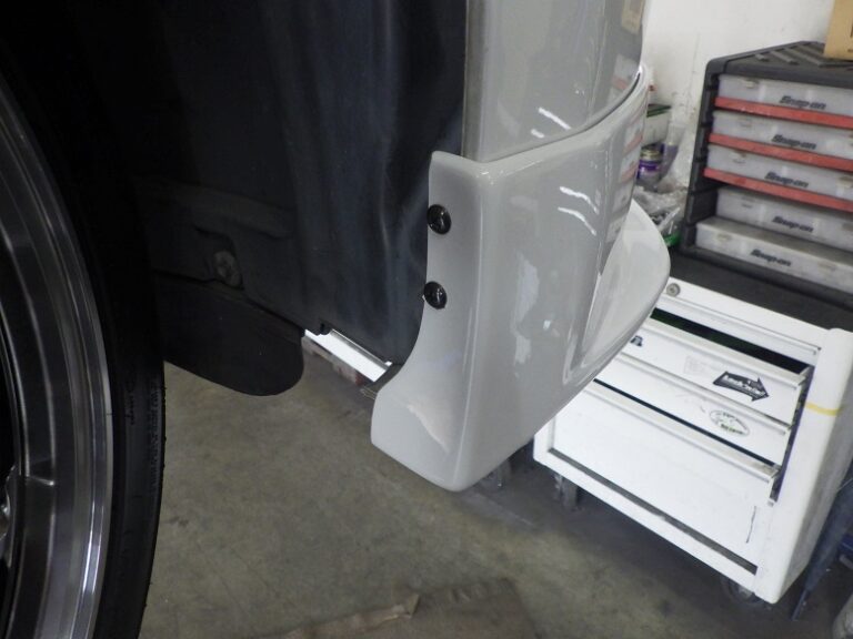 スポイラー端のタイヤハウス側は、バンパーに穴あけしてボルト、ナットで固定します。