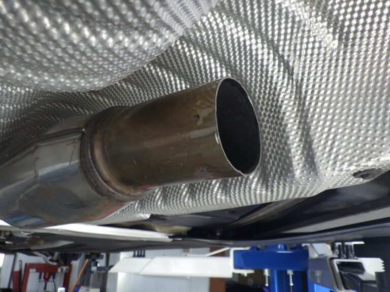 マフラー取り付けは、後部から純正マフラーをカットします。カットは、真っ直ぐ綺麗にカットして
