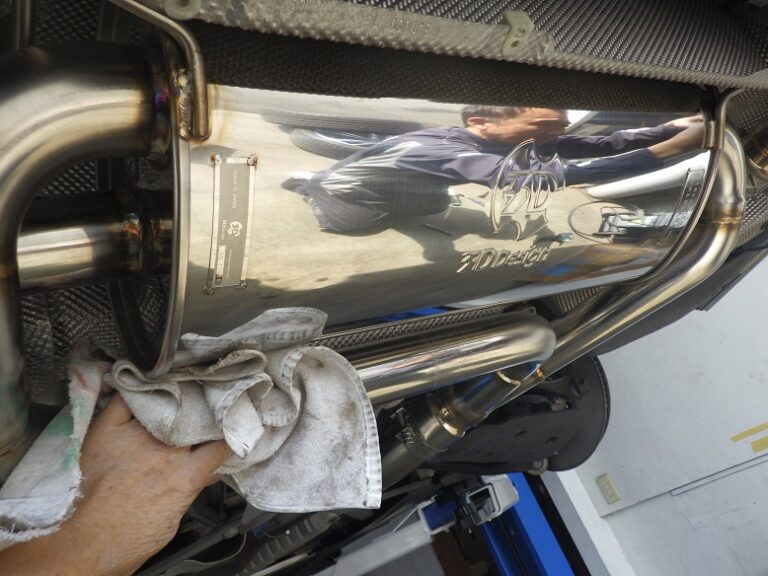 マフラーテールの位置調整を慎重に行い仕上げは、ステンレスマフラー本体の手垢取りをして綺麗にして