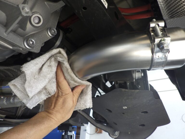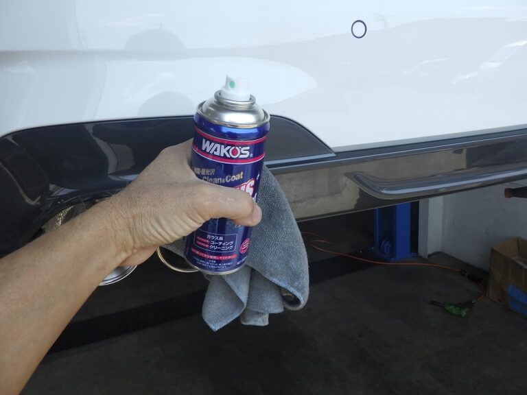 マフラー取り付けしてからテールの位置調整を行いマフラー本体に付いた手垢を綺麗に除去してからリアディフューザーの