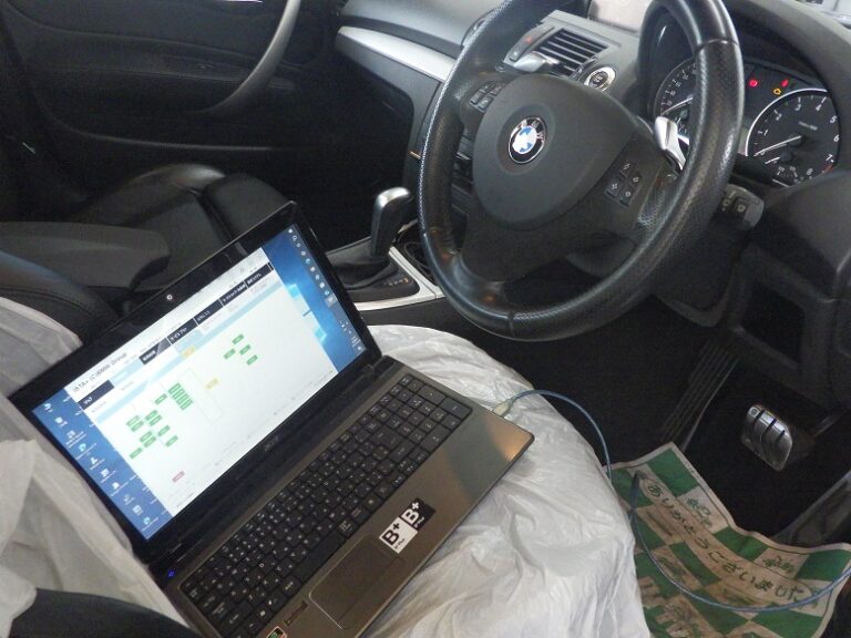 車検キャンペーンをご利用にてアライメント調整を行いバッテリー診断をしてからBMW専用テスターを車両に接続して