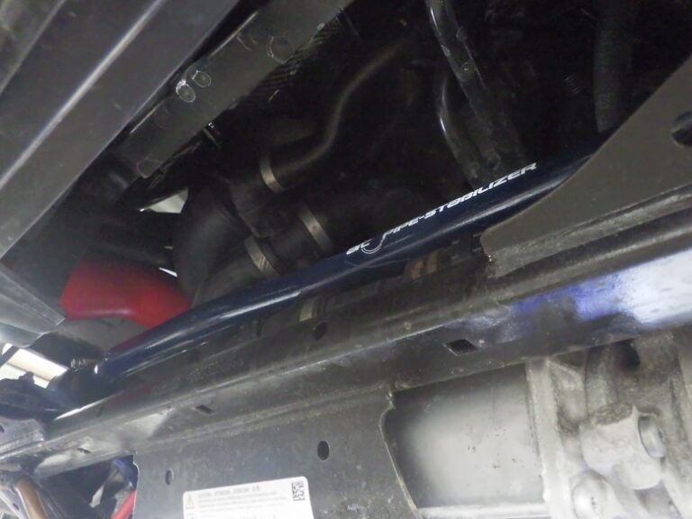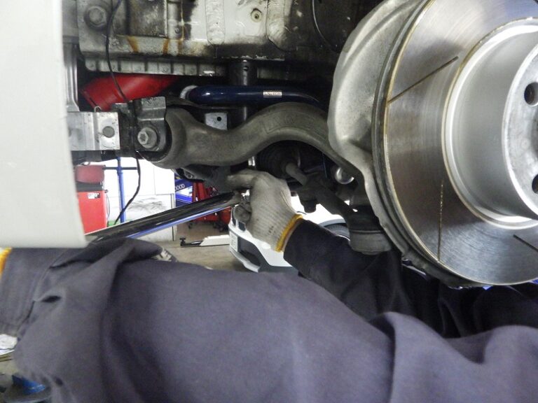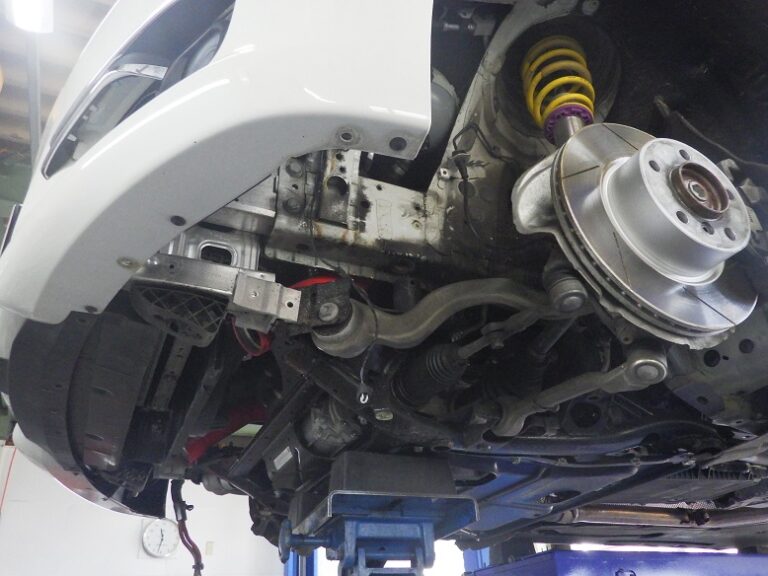 スタビの位置修正を行います。サブフレームのボルトを外したので締め付けは、規定トルクにてトルクレンチを使用して