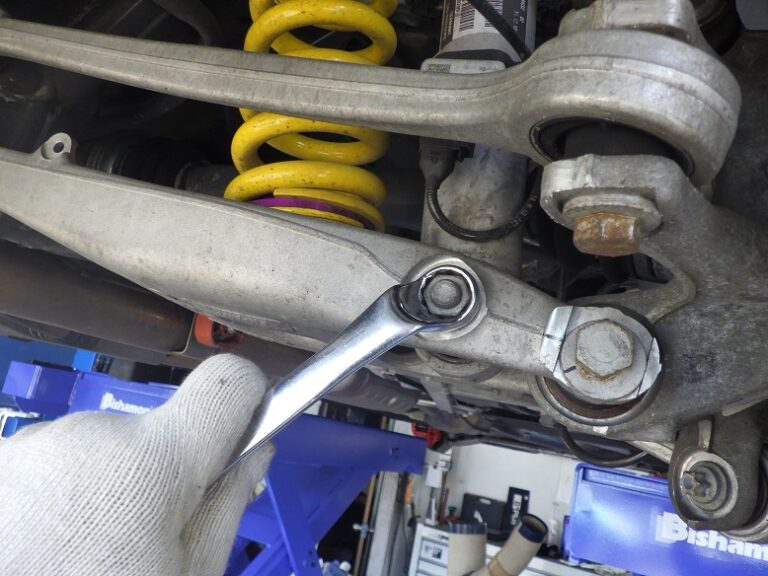 車両をリフトアップ時に脚関連の部品が社外品に変更されている場合は、取り付け部分の増し締めを行います