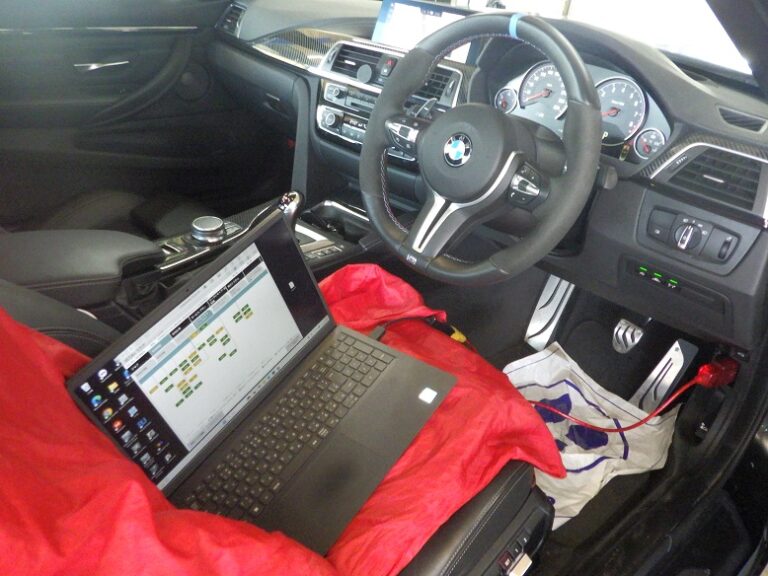 最後にBMW専用テスターを車両に接続してコンピューター診断を行いエラーチェック、消去、サービスインターバルリセット