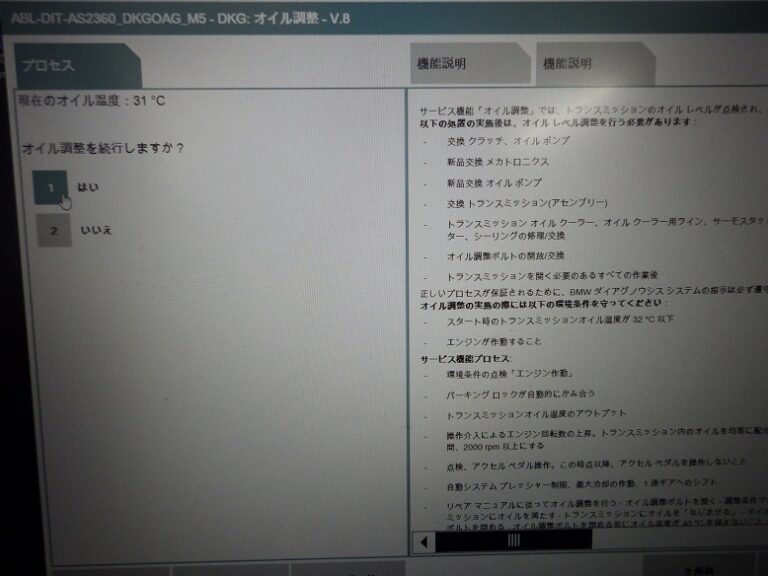 フルード量調整には、BMW専用テスターを車両に接続して温度管理をしながら調整していきます。