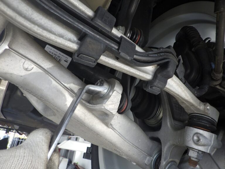 車両をリフトアップ時に脚関連の部品が社外品に変更されている場合は、取り付け部分の増し締めを行います