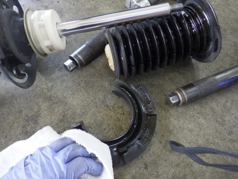 当店で取り付けの際には、再利用する純正部品は、綺麗にしてから組み付けしてリアのスプリング取り付け底面部に