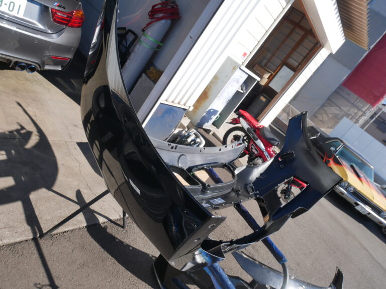 フロントバンパーは、修復不可能の為、新品を取り寄せして外注先の板金工場に一度車両を移動して現車にて