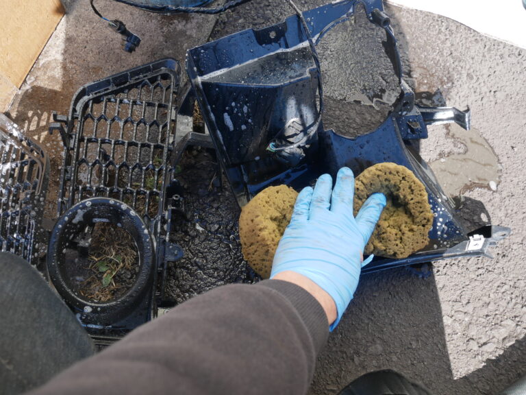 色合わせを行い塗装をして完了してから当店にバンパーを運んで車両を移動して組み付けしていきます。