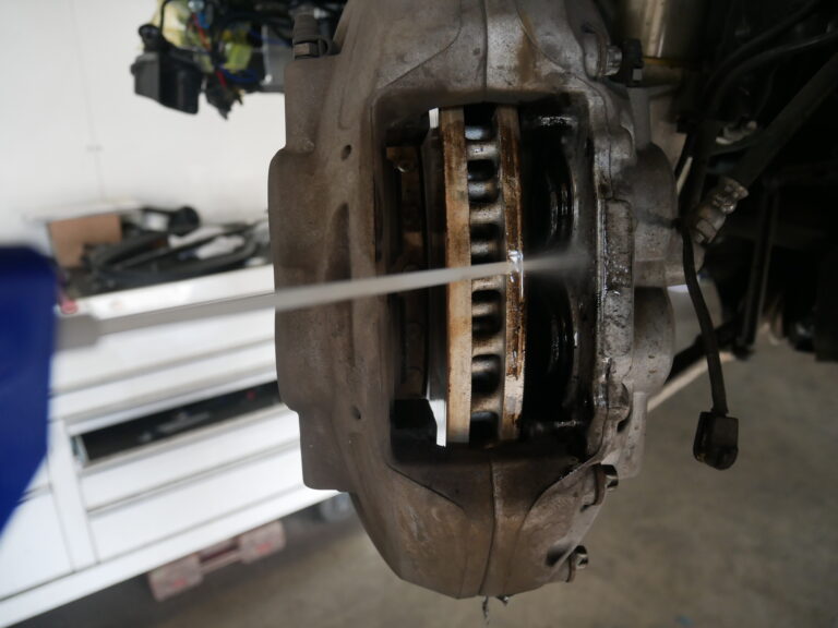 取り外して表面の洗浄とグリスアップを行いキャリパーシールからのフルード滲みを点検してキャリパーまわりの