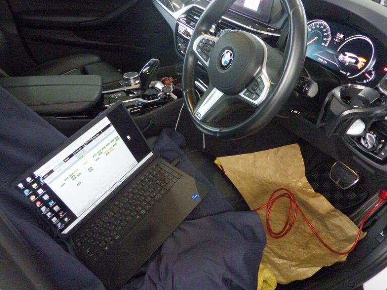 最後にBMW専用テスターを車両に接続してコンピューター診断を行いエラーチェック、消去、サービスインターバルリセット