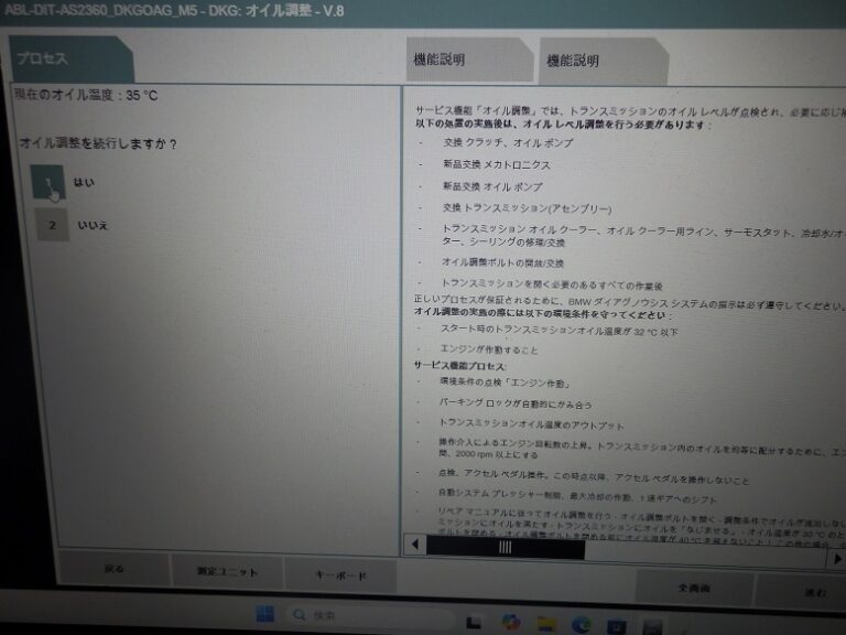 フルード量の調整は、BMW専用テスターを車両に接続して温度管理をしながら調整します。
