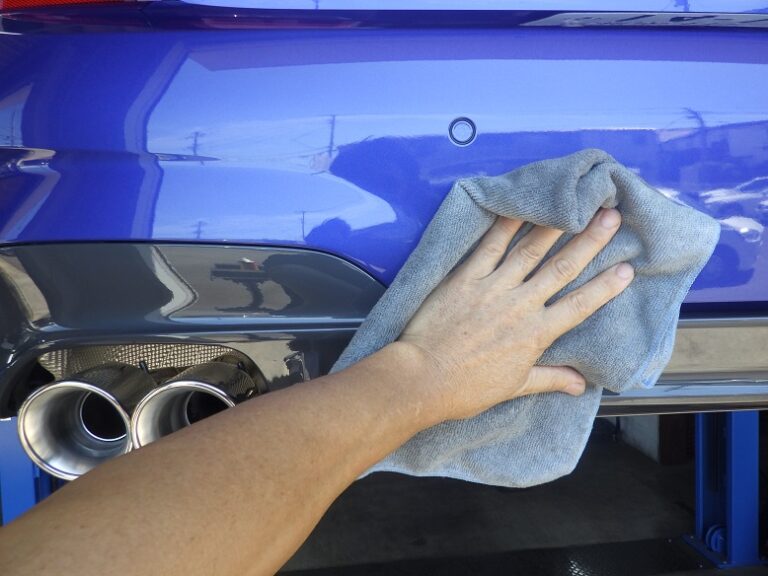 マフラーテールの位置調整をしてからリアバンパーとリアディフューザーについた手垢の除去を簡易コーテイング剤に