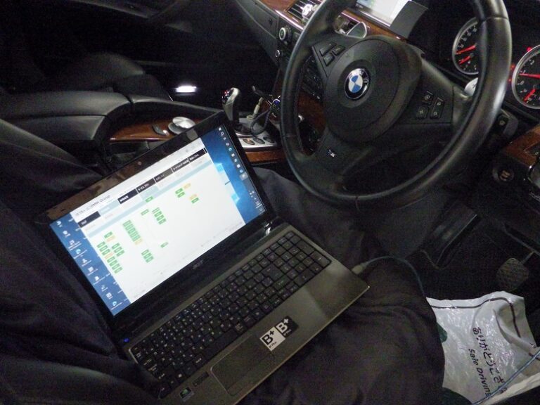 最後にBMW専用テスターを車両に接続してコンピューター診断を行いエラーチェック、消去、サービスインターバルリセット