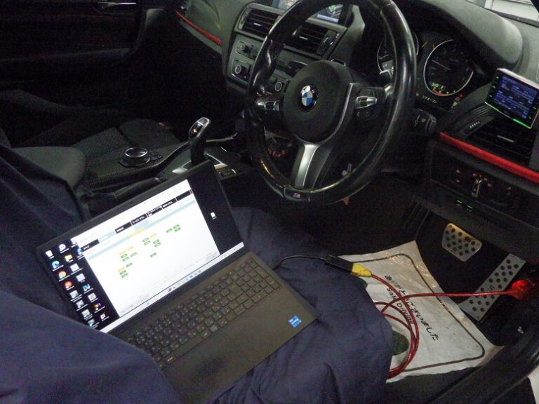 最後にBMW専用テスターを車両に接続してコンピューター診断を行いエラーチェック、消去、