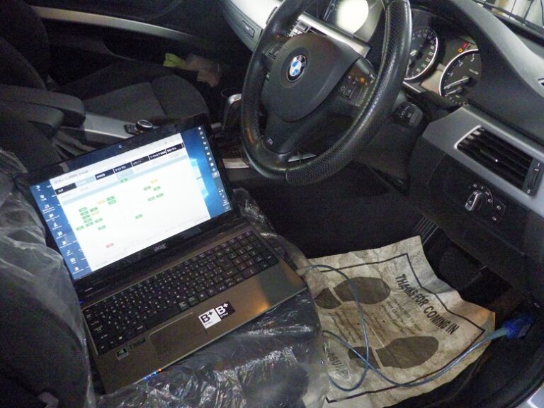 バッテリー診断を行いBMW専用テスターを車両に接続してコンピューター診断を行いエラーチェック、