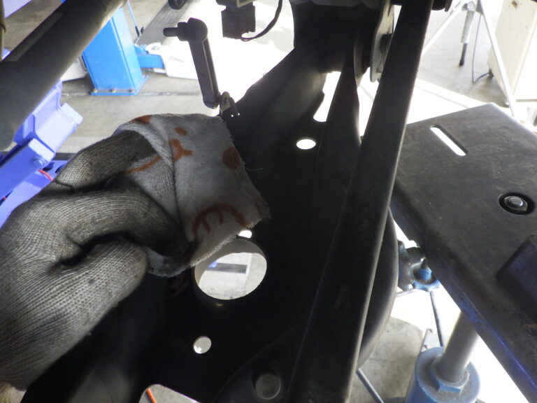 リアのスプリング取り付け底面には、砂利がたまることが多いのですべて除去してから新品部品を組み込みます