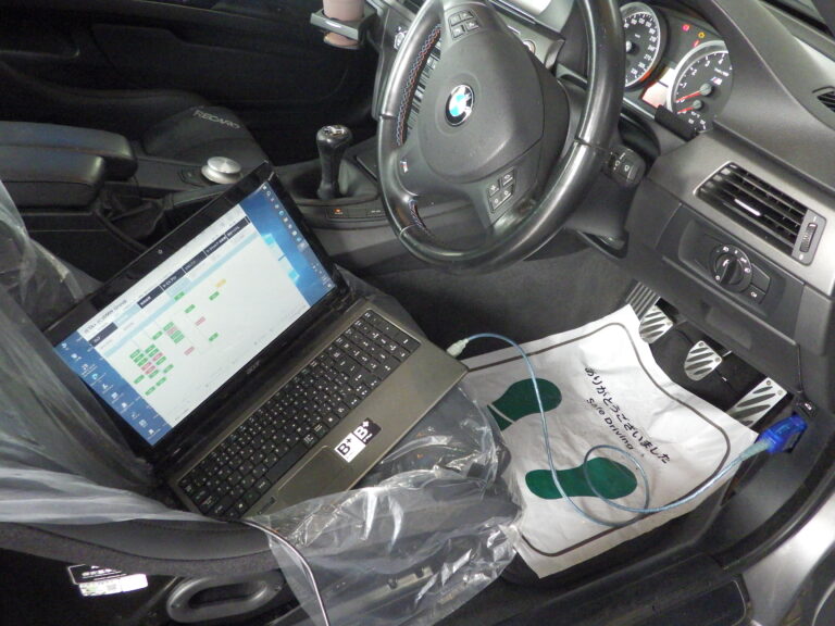 バッテリー診断を行いBMW専用テスターを車両に接続してコンピューター診断を行いエラーチェック、