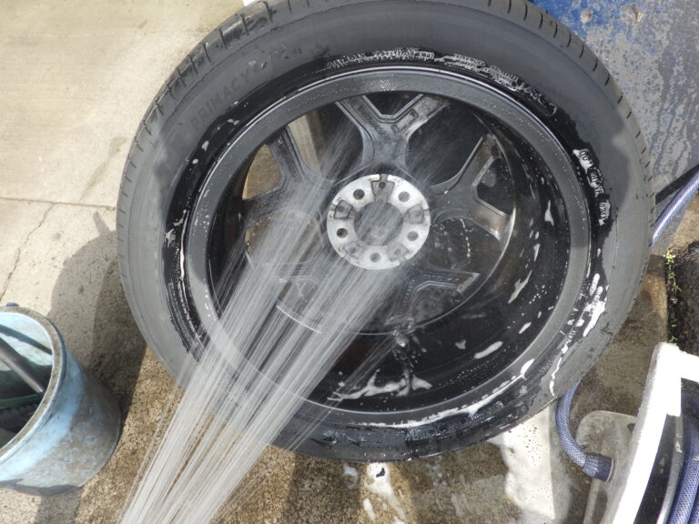 を行いホイールは、裏も表も綺麗に洗います。こちらのお車は、タイヤの溝の残量が少なく表面のヒビも多く