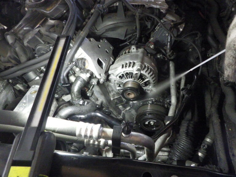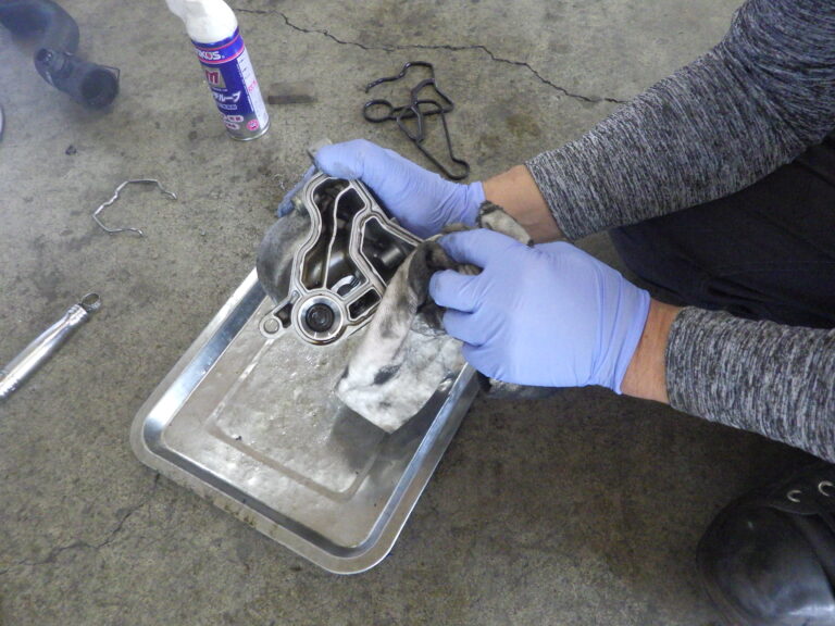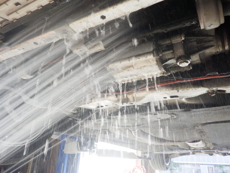 交換後は、漏れたオイルの汚れを高圧洗浄機で洗浄してからビープラスオリジナルルブロス製オイル