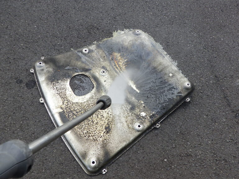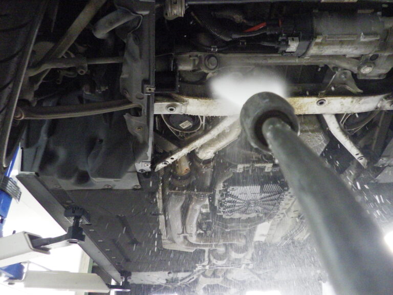 漏れたオイルの汚れとクーラントの汚れを高圧洗浄機で綺麗に洗浄したあとに試走を行い再度、リフトアップ