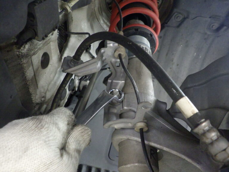 車両をリフトアップ時に脚関連の部品が社外品に変更されている場合は、取り付け部分の増し締めを行います