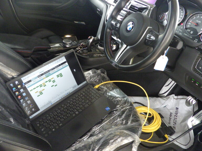 最後にBMW専用テスターを車両に接続してコンピューター診断を行いエラーチェック、消去、サービスインターバルリセット
