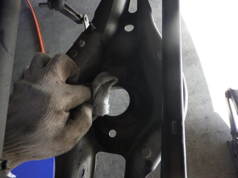 当店で作業の際には、再利用する純正部品は、綺麗にしてから組付けを行いリアのスプリングの取り付け部分の