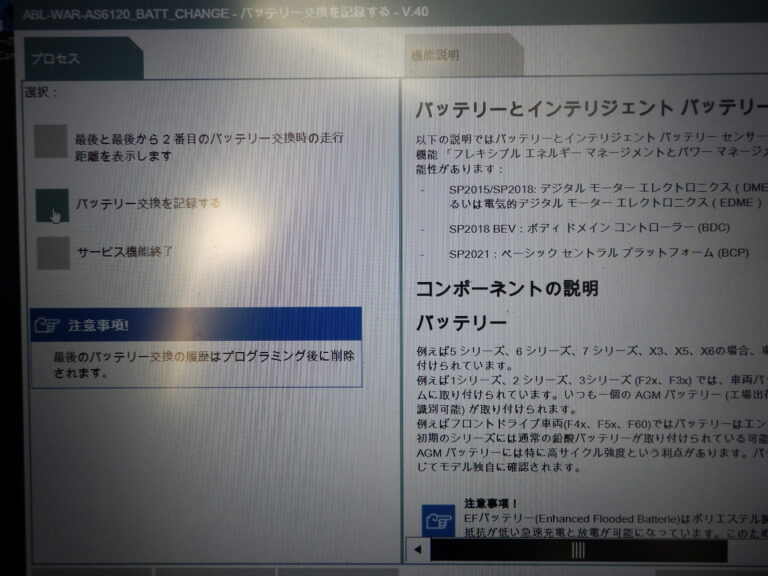ユーロAGMバッテリーを使用して新品交換しました。交換後は、BMW専用テスターを車両に接続して