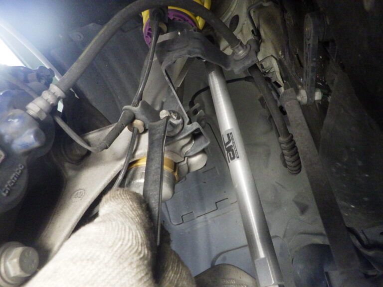 車両をリフトアップ時に脚関連の部品が社外品に変更されている場合は、取り付け部分の増し締めを行います
