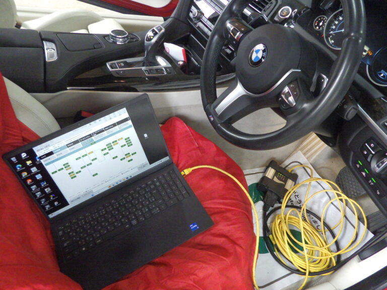 バッテリー診断を行いBMW専用テスターを車両に接続してコンピューター診断を行いエラーチェック