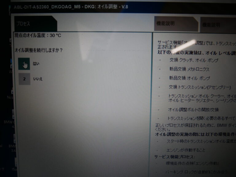 この作業で重要なのは、フルード液量の調整となります。BMW専用テスターを車両に接続してフルード温度の管理を