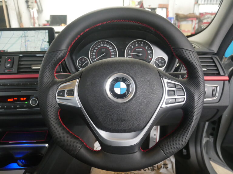 F30 320iのお客様にファスピエルト製ステアリングの特注バージョン赤ステッチ仕様を取り付けしました。
