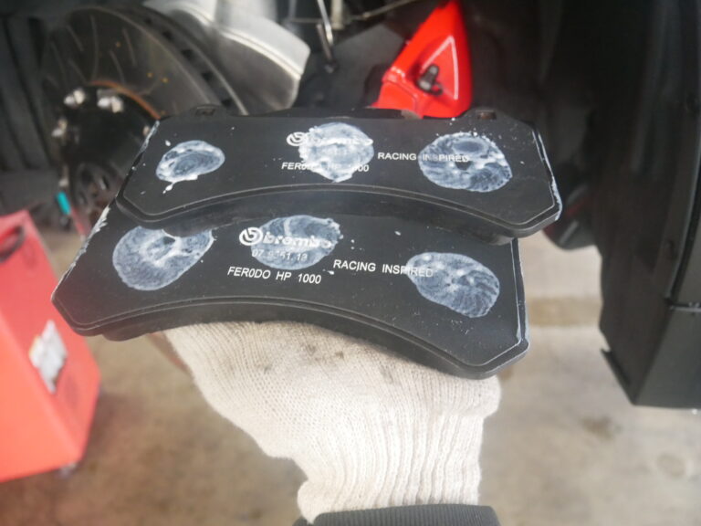 パッドは、前後とも取り外して表面の洗浄とグリスアップを行いキャリパーシールからのフルード滲みを点検します