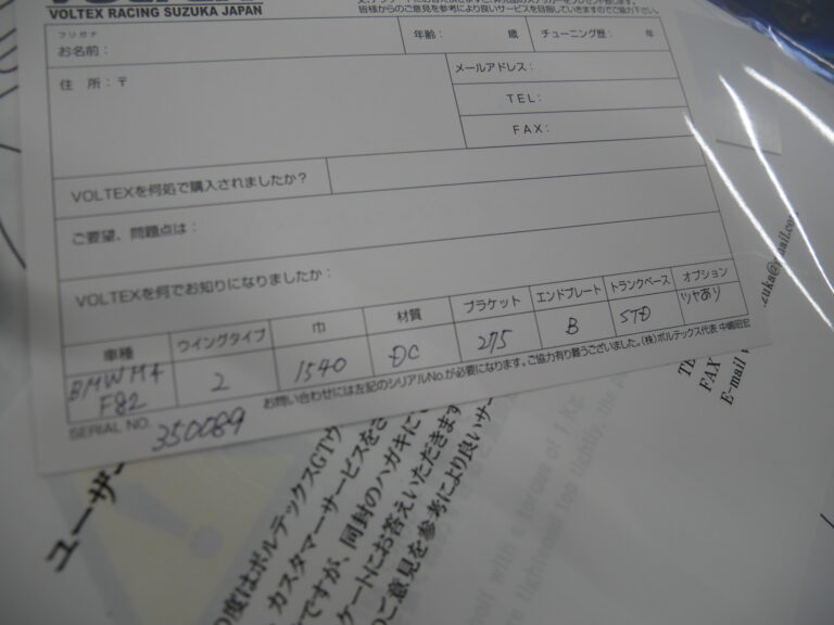 納期は、1年半待ちました。ボルテックスのGTウィングは、オーダー品なので全てが1年以上の納期がかかります