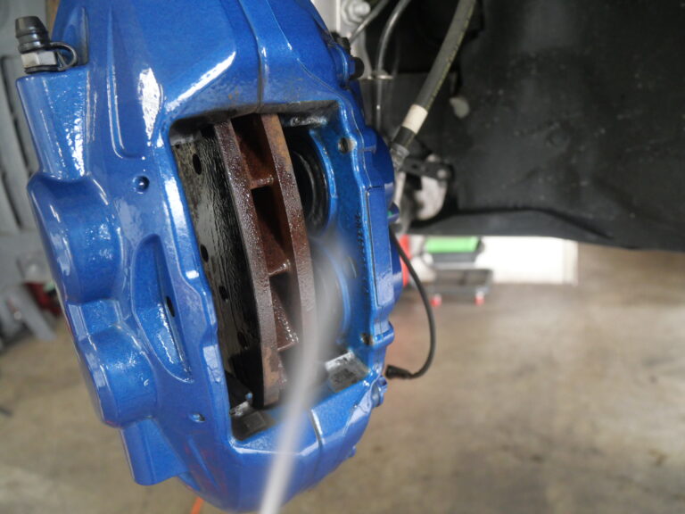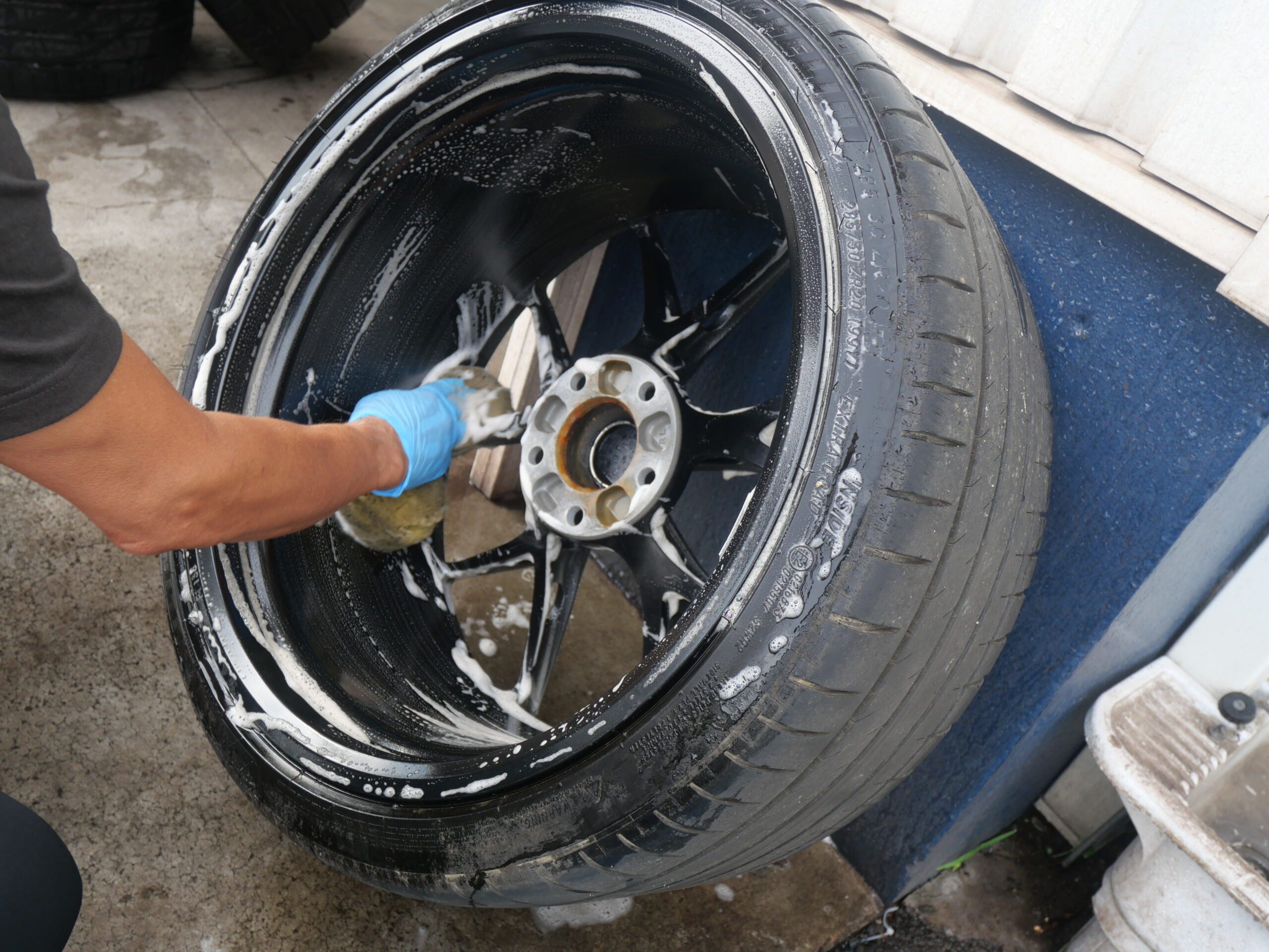 キャリパーまわりの洗浄をしてキャリパーシールからのフルード滲みの点検を行いハブ部分の錆取り、防錆処理を行いホイールは、