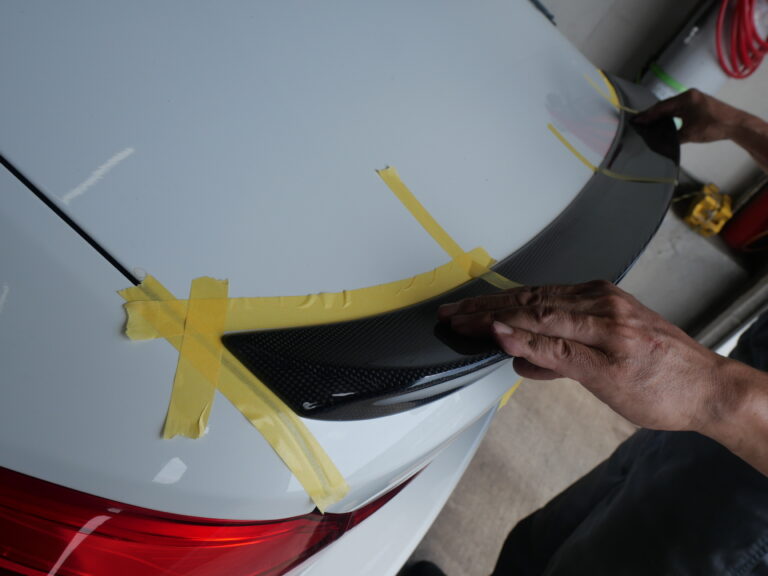 トランクスポイラー取り付け時には、仮合わせして取り付け位置決めを行い取り付け面をしっかり脱脂してから