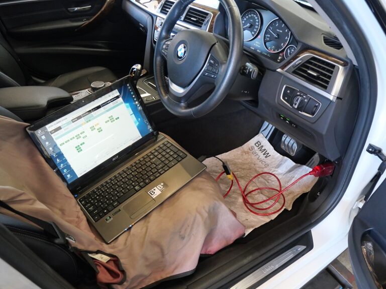 バッテリー診断を行いBMW専用テスター使用にてコンピューター診断を行いエラーチェック、消去をして