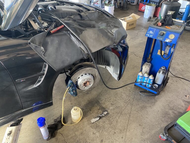 を使用にてBMW専用テスターを車両に接続してABSユニットを動かしABS内部のエア抜きとフルード交換を行いました。