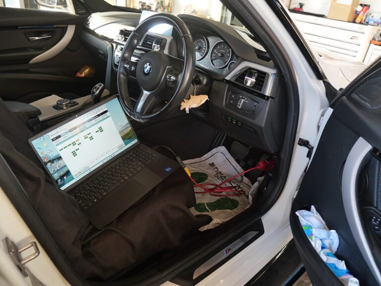 BMW専用テスターを車両に接続してコンピューター診断を行いエラーチェック、消去、サービスインターバルリセットを行い
