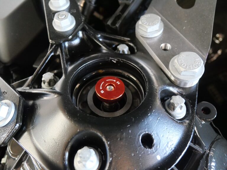 ショックの減衰調整は、フロントは、エンジンルーム内でリアは、下側のアーム付近にダイヤルがあります。