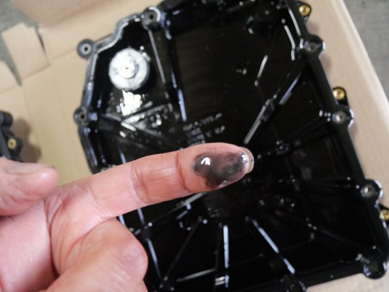 外したオイルパン内には、磁石が付いていて汚れた鉄粉が付いています・・・フルードの油量の調整は、