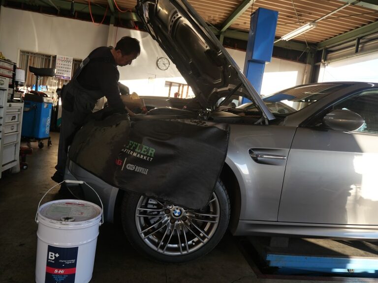 E92M3の車両では、よくあるオイル漏れ事例でして・・・交換後は、漏れたオイルの汚れを高圧洗浄機を