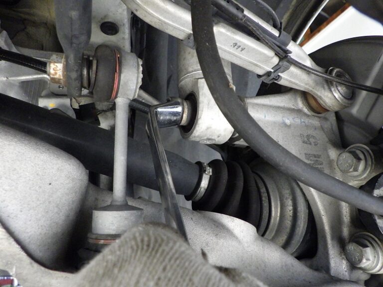 車両をリフトアップ時に脚関連の部品が社外品に変更されている場合は、取り付け部分の増し締めを行います