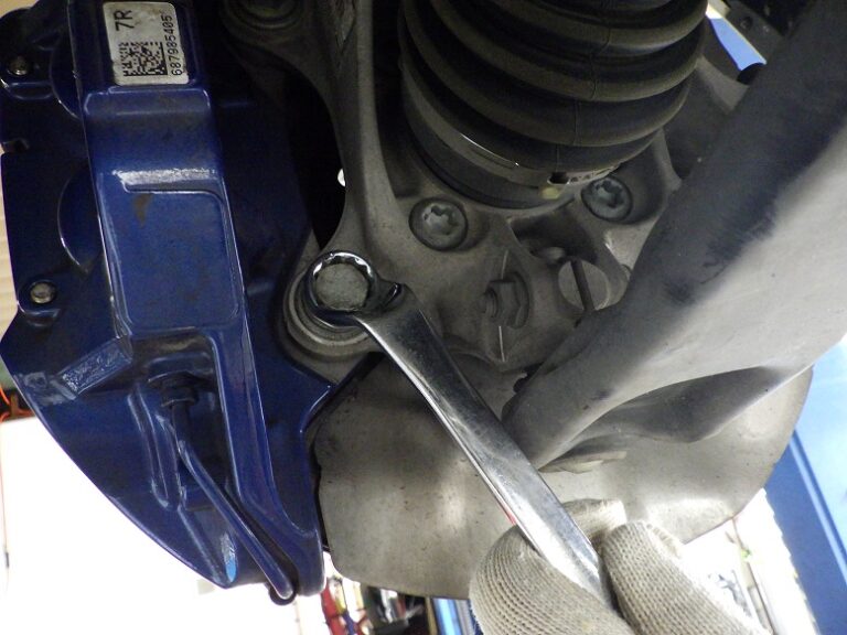 車両をリフトアップ時に脚関連の部品が社外品に変更されている場合は、取り付け部分の増し締めを行います