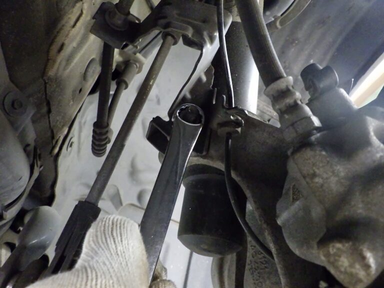 車両をリフトアップ時に脚関連の部品が社外品に変更されている場合は、取り付け部分の増し締めを行います
