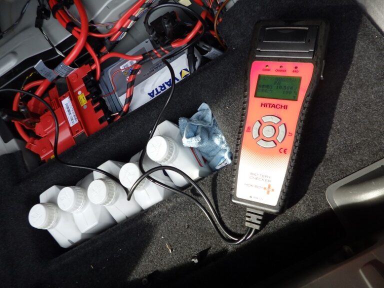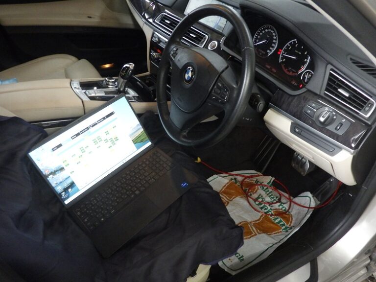 バッテリー診断を行い最後にBMW専用テスター使用にてコンピューター診断を行いエラーチェック、消去